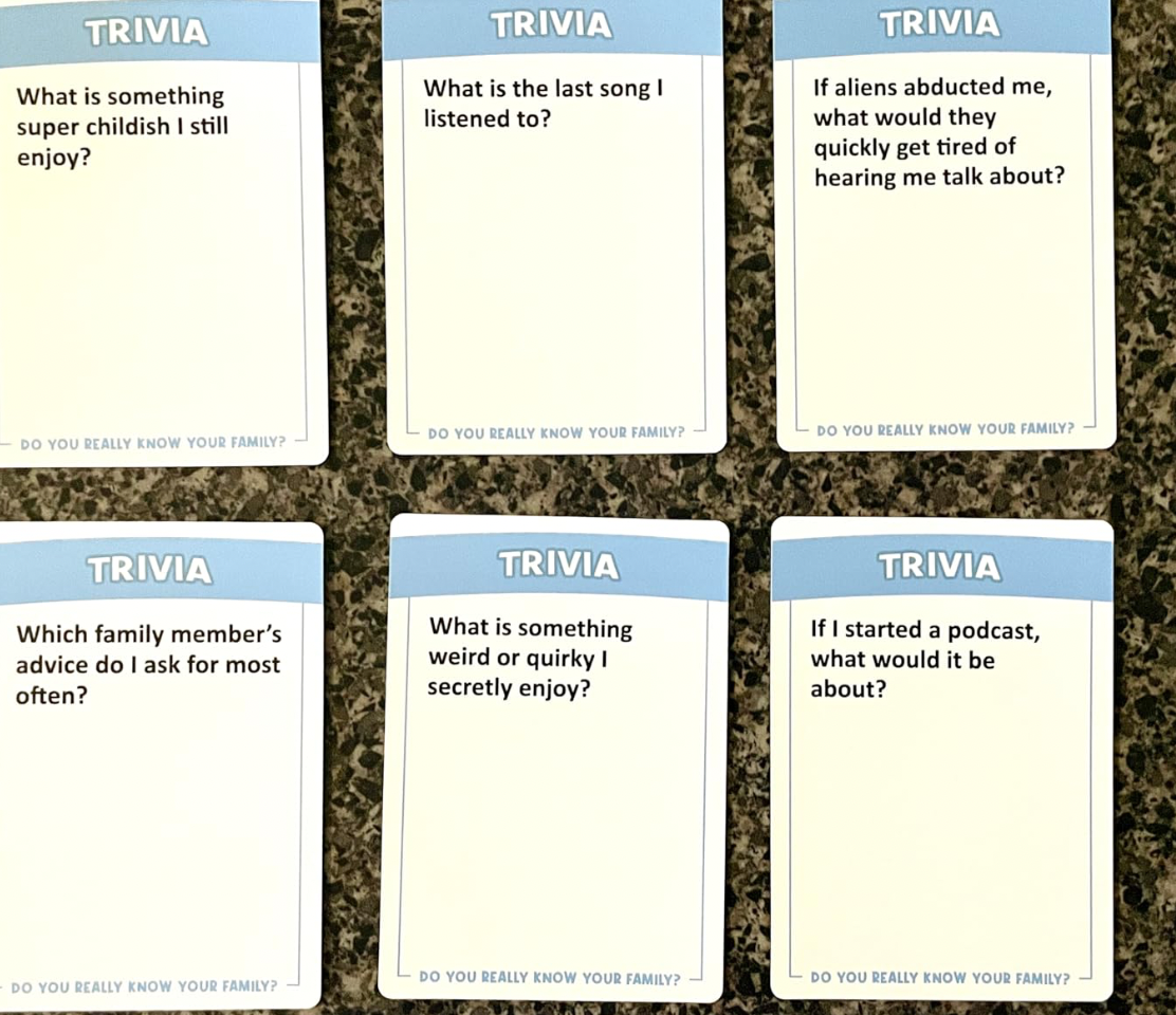 Trivia cards test family knowledge with lighthearted questions – promotes learning, competition, and shared stories in a playful format.